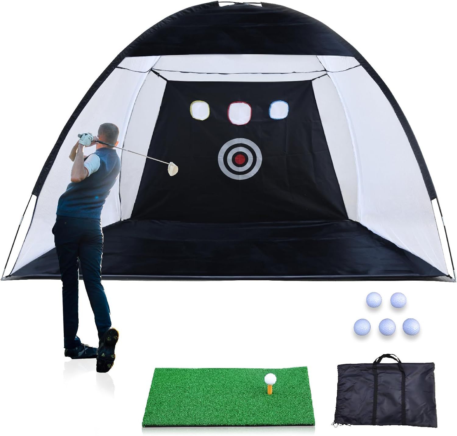 [All-Inclusive Set]: The golf net comes with a target, mat, balls, tee, and carrying bag, providing you with everything you need for a comprehensive golf practice session. The target helps improve your aim, while the mat simulates the feel of a real golf course.
