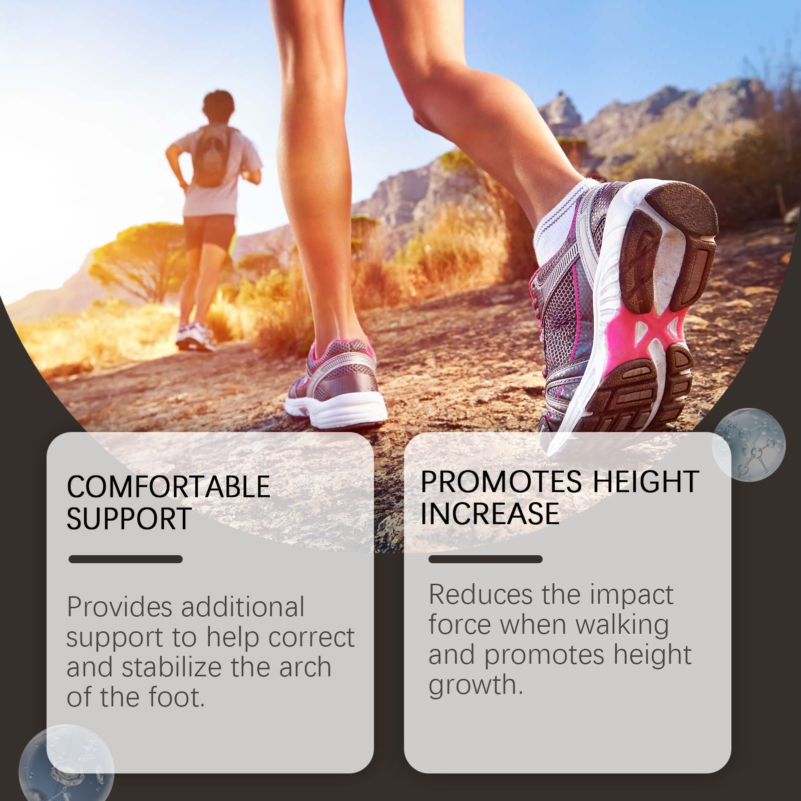 Our insoles contain EVA 60%, BK fabric 20%, nylon plastic 20%. It can provide additional support to help straighten and stabilize the arch of the foot. The way to use it is simple: put the insole into the shoe and wear it. And can the impact of walking, height growth.